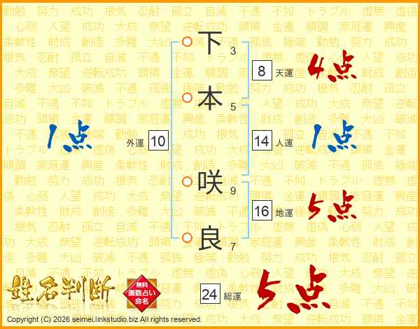 下本咲良さんの総運は24画の5点!