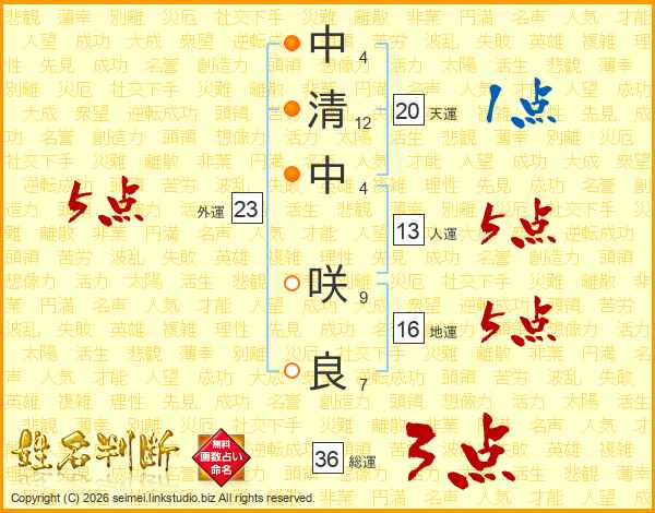中(4画)清(12画)中(4画) 咲(9画)良(7画)