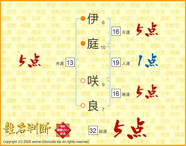 伊(6画)庭(10画) 咲(9画)良(7画)