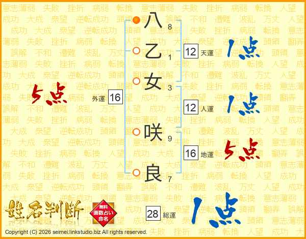 八(8画)乙(1画)女(3画) 咲(9画)良(7画)