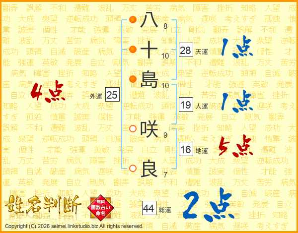 八(8画)十(10画)島(10画) 咲(9画)良(7画)