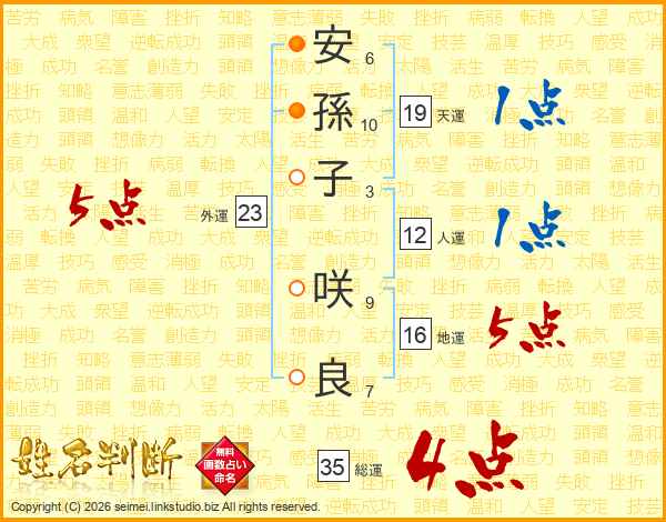 安(6画)孫(10画)子(3画) 咲(9画)良(7画)