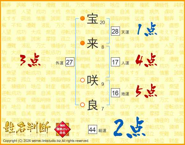 宝(20画)来(8画) 咲(9画)良(7画)