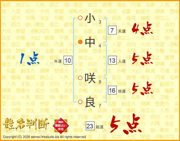 小(3画)中(4画) 咲(9画)良(7画)