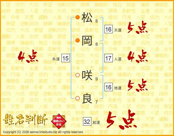 松(8画)岡(8画)  咲(9画)良(7画)