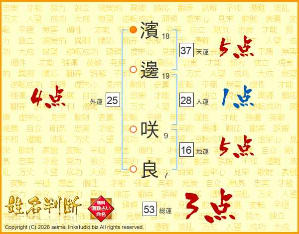 濱(18画)邊(19画) 咲(9画)良(7画)