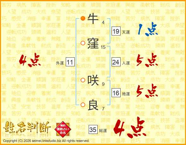 牛(4画)窪(15画) 咲(9画)良(7画)