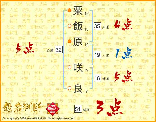 粟(12画)飯(13画)原(10画) 咲(9画)良(7画)