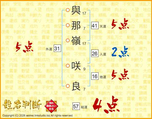 與(17画)那(7画)嶺(17画) 咲(9画)良(7画)