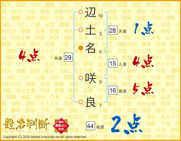 辺(19画)土(3画)名(6画) 咲(9画)良(7画)
