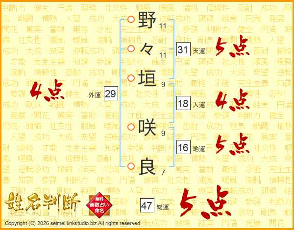 野々垣咲良さんの総運は47画の5点!