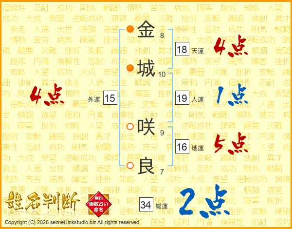 金(8画)城(10画) 咲(9画)良(7画)