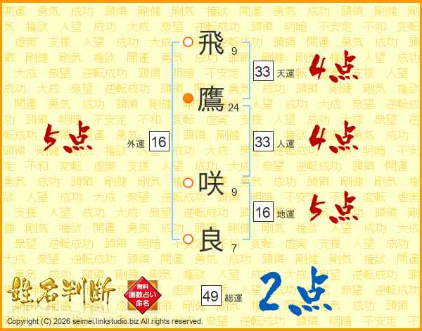 飛(9画)鷹(24画) 咲(9画)良(7画)