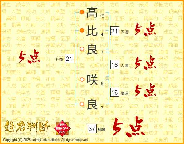 高(10画)比(4画)良(7画) 咲(9画)良(7画)