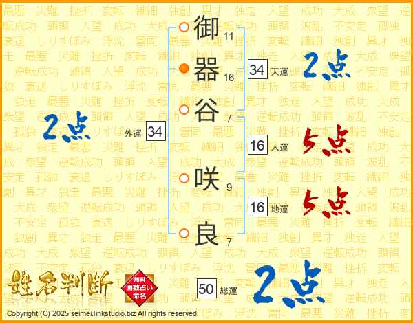 御(11画)器(16画)谷(7画) 咲(9画)良(7画)