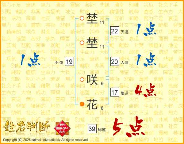埜埜咲花さんの総運は39画の5点!