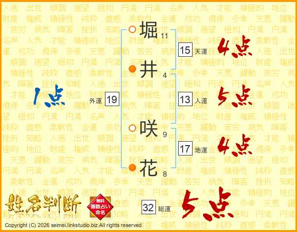 生活面を象徴する運勢です。外部から受ける影響力を表し、結婚運、家庭運や職場、環境への順応性を表します。総運から人運を引いた画数。姓や名が1文字の場合を除く。