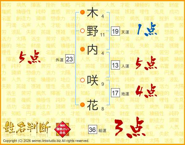 木(4画)野(11画)内(4画) 咲(9画)花(8画)