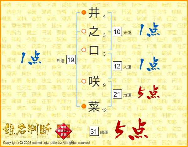 井(4画)之(3画)口(3画) 咲(9画)菜(12画)