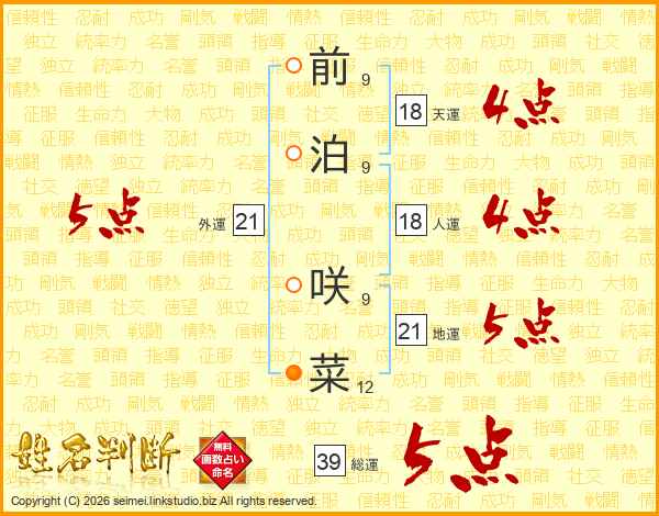 前(9画)泊(9画) 咲(9画)菜(12画)
