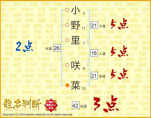 小(3画)野(11画)里(7画) 咲(9画)菜(12画)