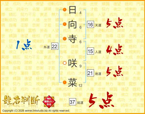 日向寺咲菜さんの総運は37画の5点!