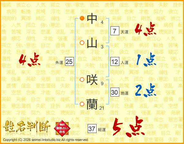 中(4画)山(3画) 咲(9画)蘭(21画)