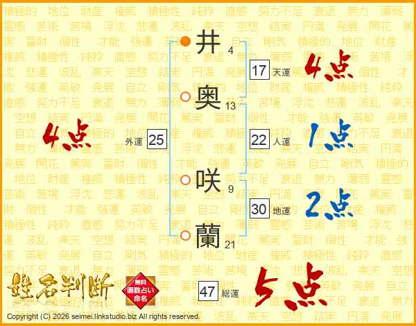 井(4画)奥(13画) 咲(9画)蘭(21画)