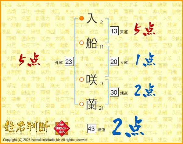 入(2画)船(11画) 咲(9画)蘭(21画)