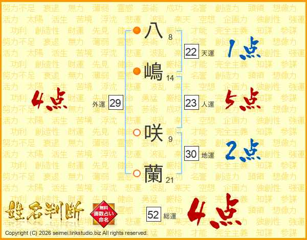 八嶋咲蘭さんの総運は52画の4点!