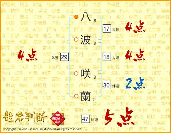 八(8画)波(9画) 咲(9画)蘭(21画)