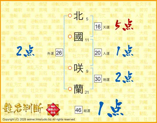北國咲蘭さんの天運は16画の5点!