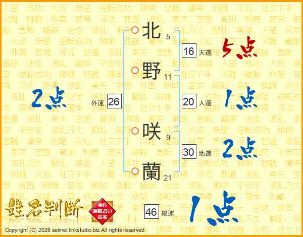 北(5画)野(11画) 咲(9画)蘭(21画)