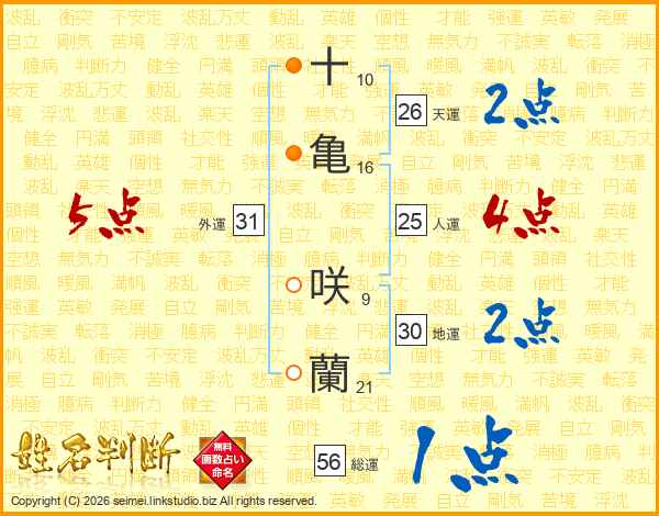 十(10画)亀(16画) 咲(9画)蘭(21画)