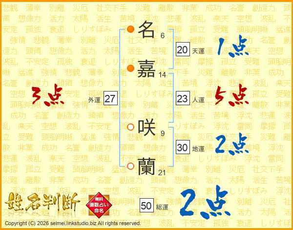 名(6画)嘉(14画) 咲(9画)蘭(21画)