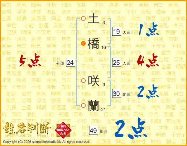 土橋咲蘭さんの総運は49画の2点!