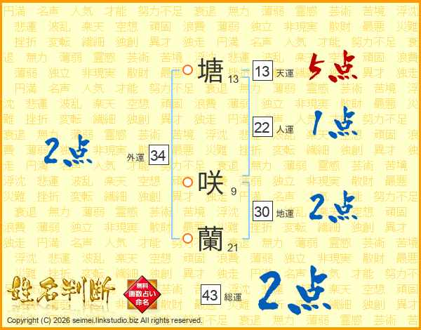 生活面を象徴する運勢です。外部から受ける影響力を表し、結婚運、家庭運や職場、環境への順応性を表します。総運から人運を引いた画数。姓や名が1文字の場合を除く。