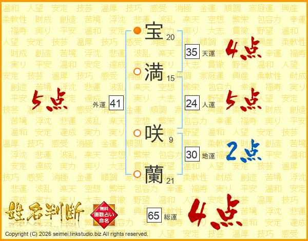 宝(20画)満(15画) 咲(9画)蘭(21画)