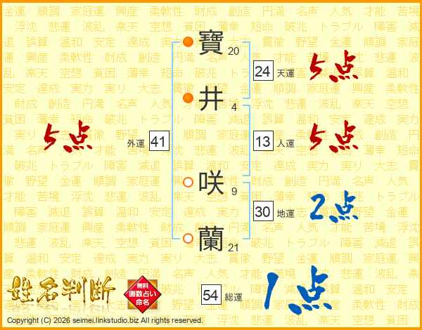 寶(20画)井(4画) 咲(9画)蘭(21画)