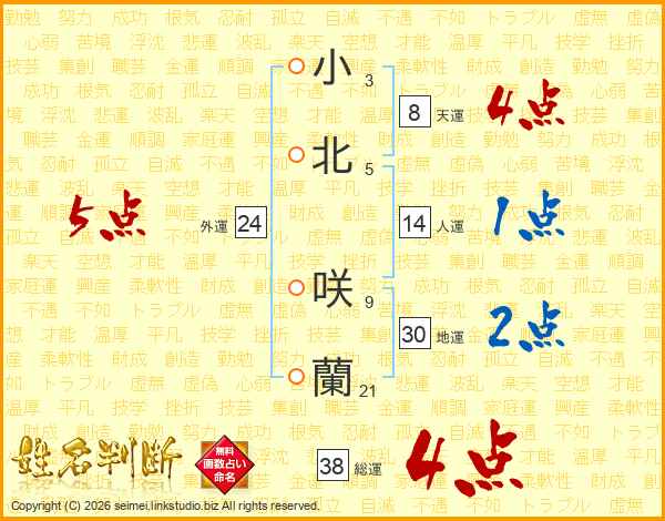 小(3画)北(5画) 咲(9画)蘭(21画)