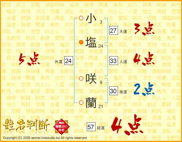 小(3画)塩(24画) 咲(9画)蘭(21画)