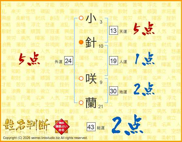 小(3画)針(10画) 咲(9画)蘭(21画)