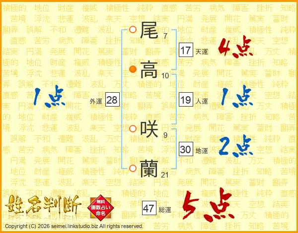 尾(7画)高(10画) 咲(9画)蘭(21画)