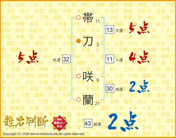 帯(11画)刀(2画) 咲(9画)蘭(21画)