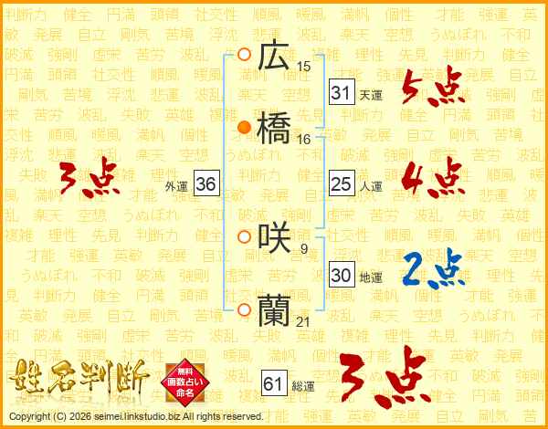 広橋咲蘭さんの総運は61画の3点!