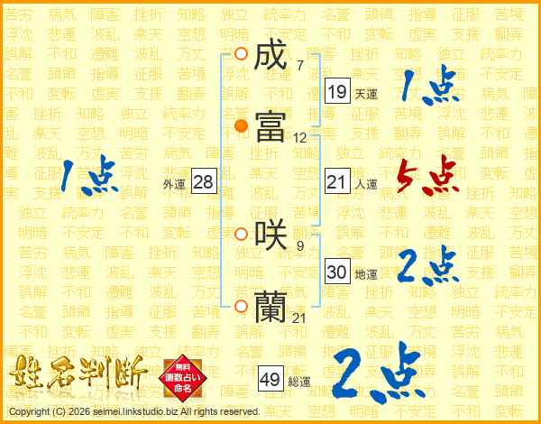 成(7画)富(12画) 咲(9画)蘭(21画)