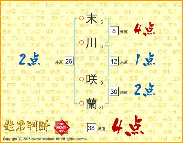 末(5画)川(3画) 咲(9画)蘭(21画)