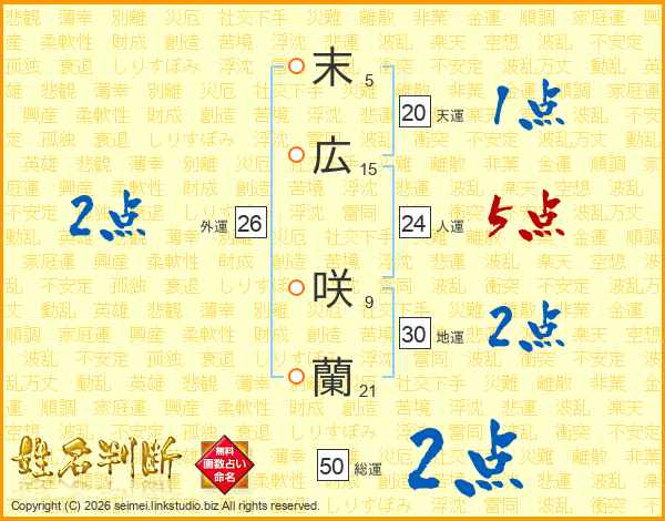 末(5画)広(15画) 咲(9画)蘭(21画)