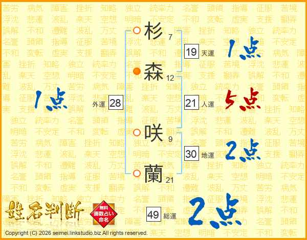 杉(7画)森(12画) 咲(9画)蘭(21画)