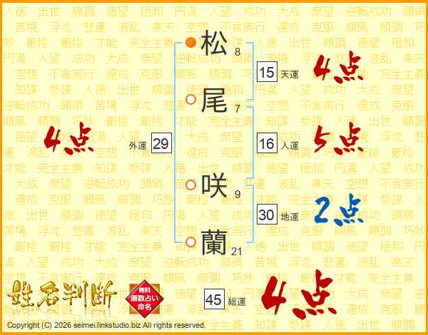 松(8画)尾(7画) 咲(9画)蘭(21画)